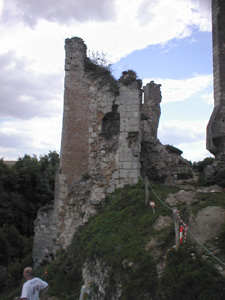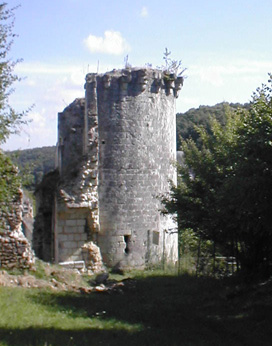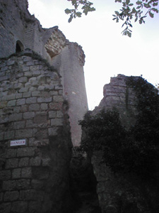 Sortir du donjon, le contourner par le sud et se rendre derrière ce dernier, devant les vestiges d'une imposante tour aujord'hui penchée.